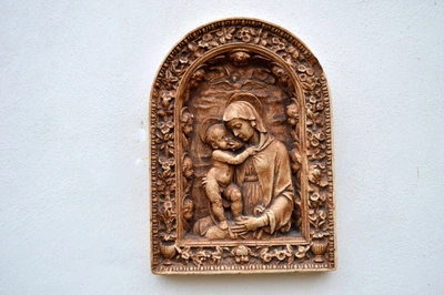 - Reliéf panna Marie s Jezuletem a 10 Cherubínů, imitace dřeva, výška - 27 cm